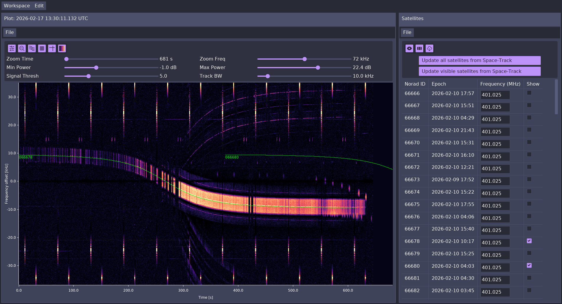 rSTRF started out as a pet project to try out Rust (sorry for the name), but it’s escalated into a full-blown GPU-accelerated waterfall renderer. In my slightly biased opinion, it feels much nicer to use than STRF’s pgplot. It features