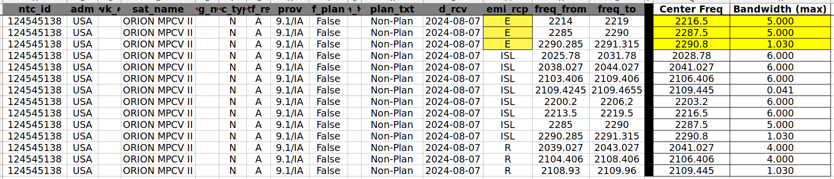 The previous mission Artemis 1 was on 2216.5 MHz, does any one know the frequency for Artemis II? Can anyone find it up on the itu website? The crewed module might be named ORION.