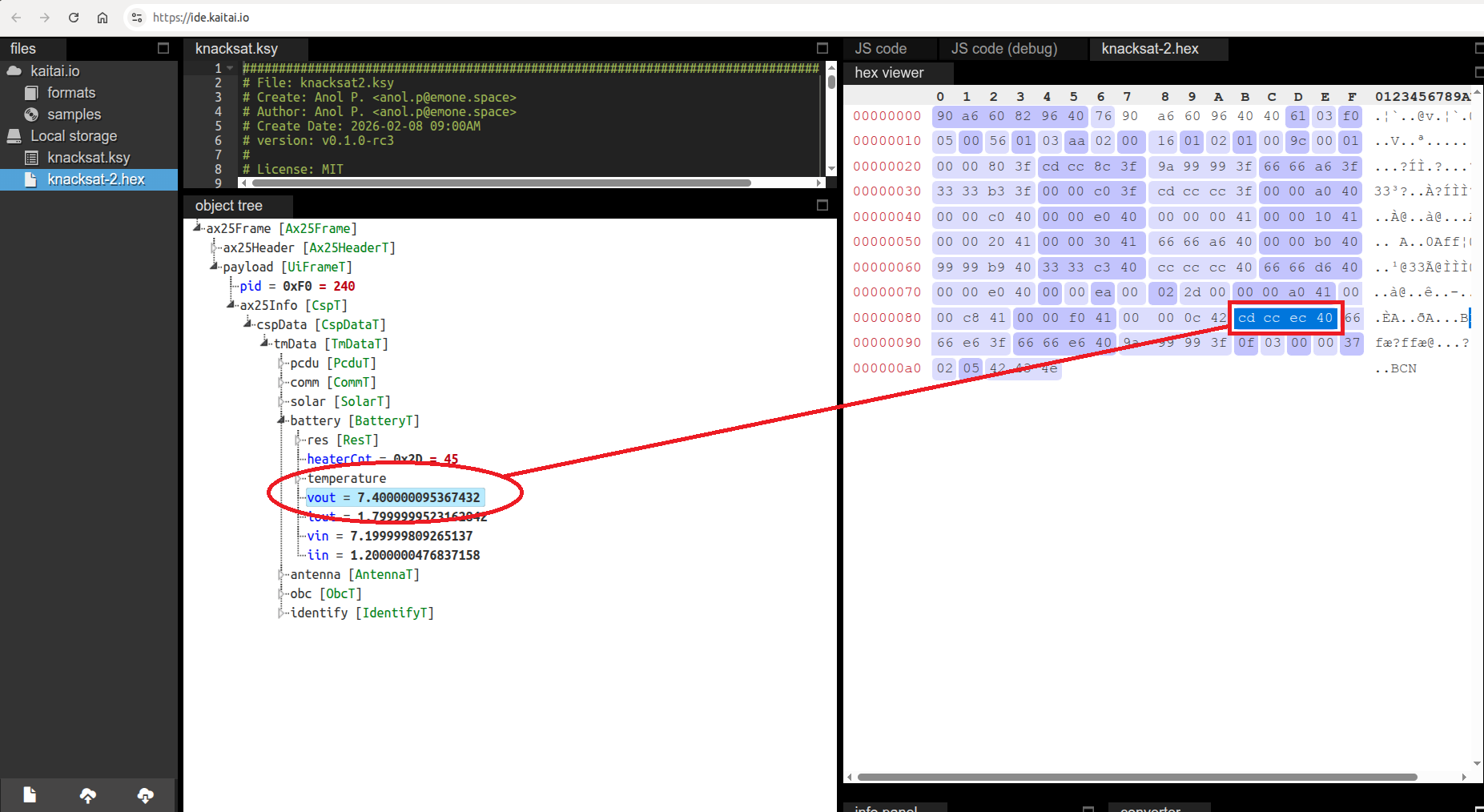 Tested on https://ide.kaitai.io with knacksat.hex.txt (165 Bytes) using knacksat.ksy.txt (8.2 KB) (remove .txt).