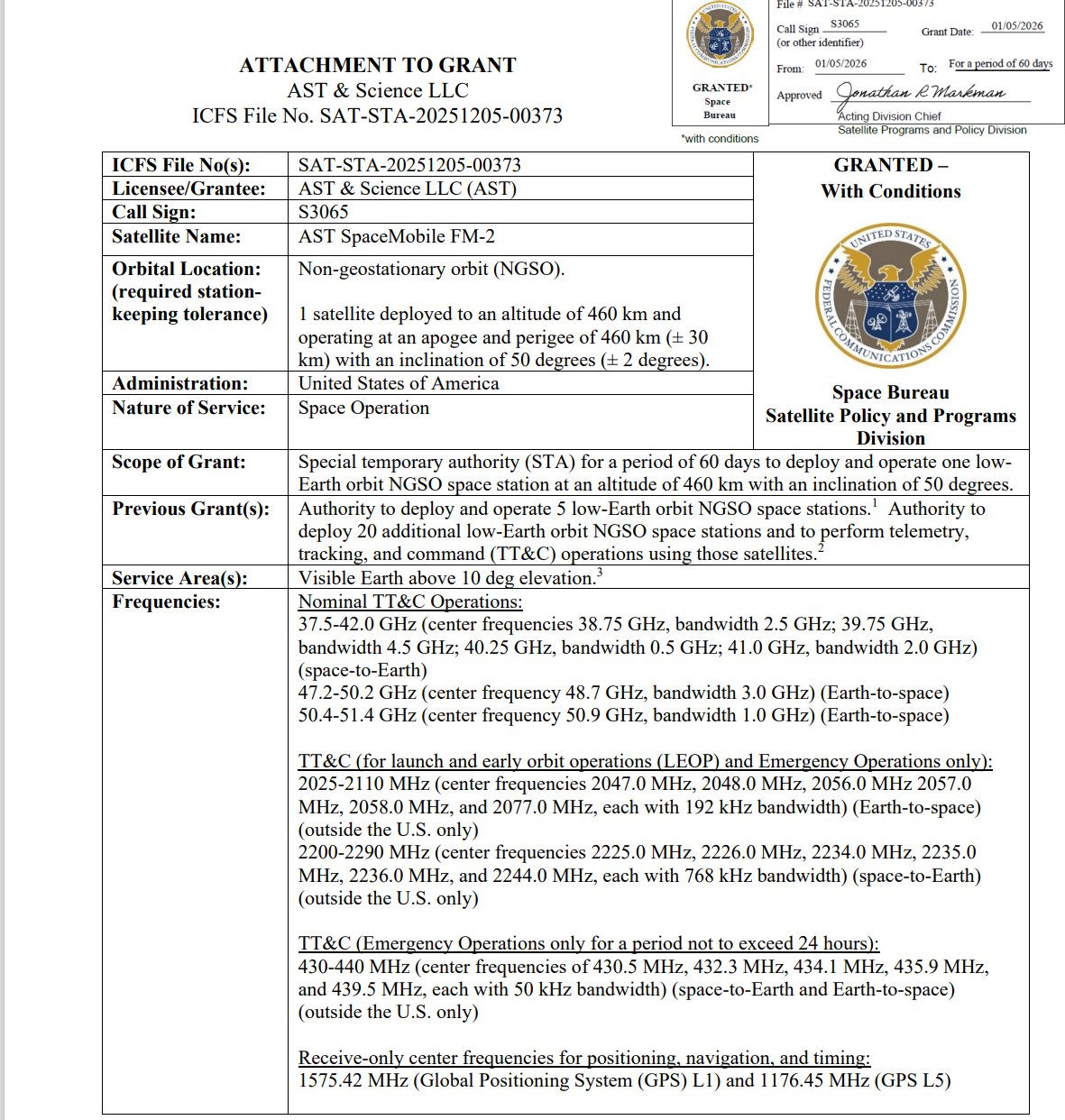 according to AST SpaceMobile in a note to the FCC regarding FM1, BlueBird-6: