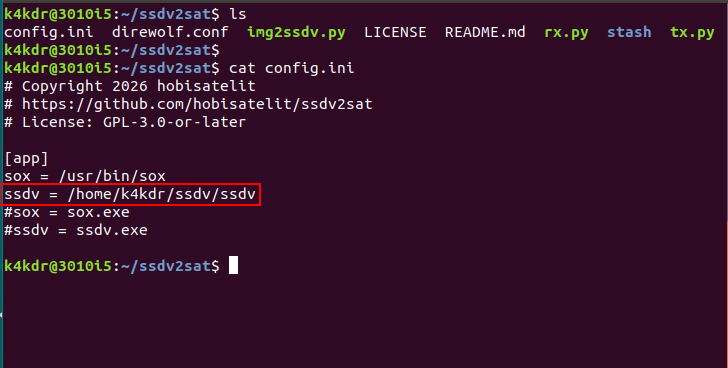 Please note the config.ini file where you can specify where the ssdv app is installed on your system. There are also example Windows entries (commented out) that illustrate how to specify the location of an ssdv.exe program on your computer.