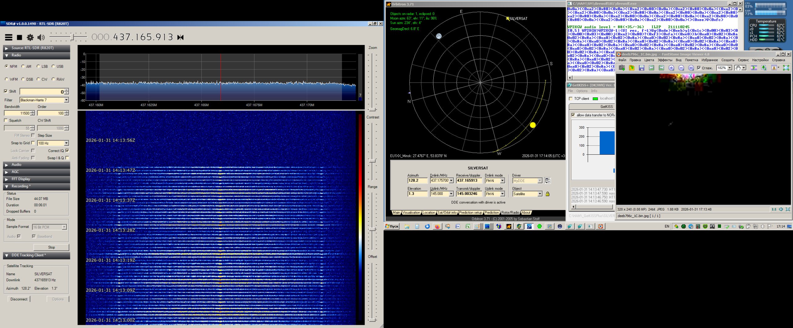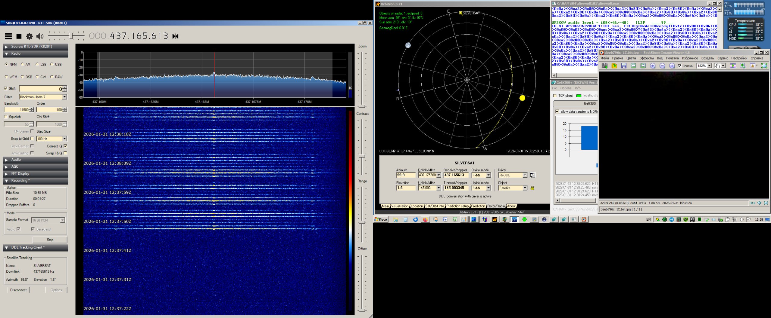 Also attaching an overal view of my helical antenna, and screenshots of the full waterfall and maximum peak signal form in case if satellite operators need this information.