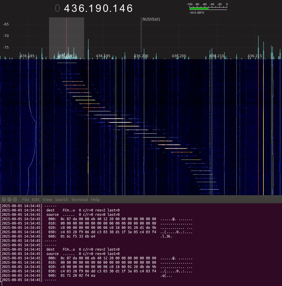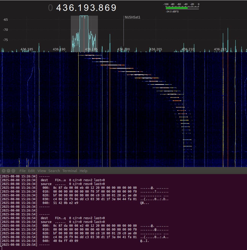 15m of LMR-400 feeds various SDRs; today it was the Airspy-R2. Audio output from GQRX feeds a GNU-Radio/gr-satellites flowgraph, so changing baud rate was easy to do. However, going from 1200 to 2400, I also removed the 600 Hz deviation setting in the FSK block and took a guess that 2400 might be better (while I’m sure that is not the correct value - it worked). With signals this strong, 2400 decoded just as well as 1200 did.