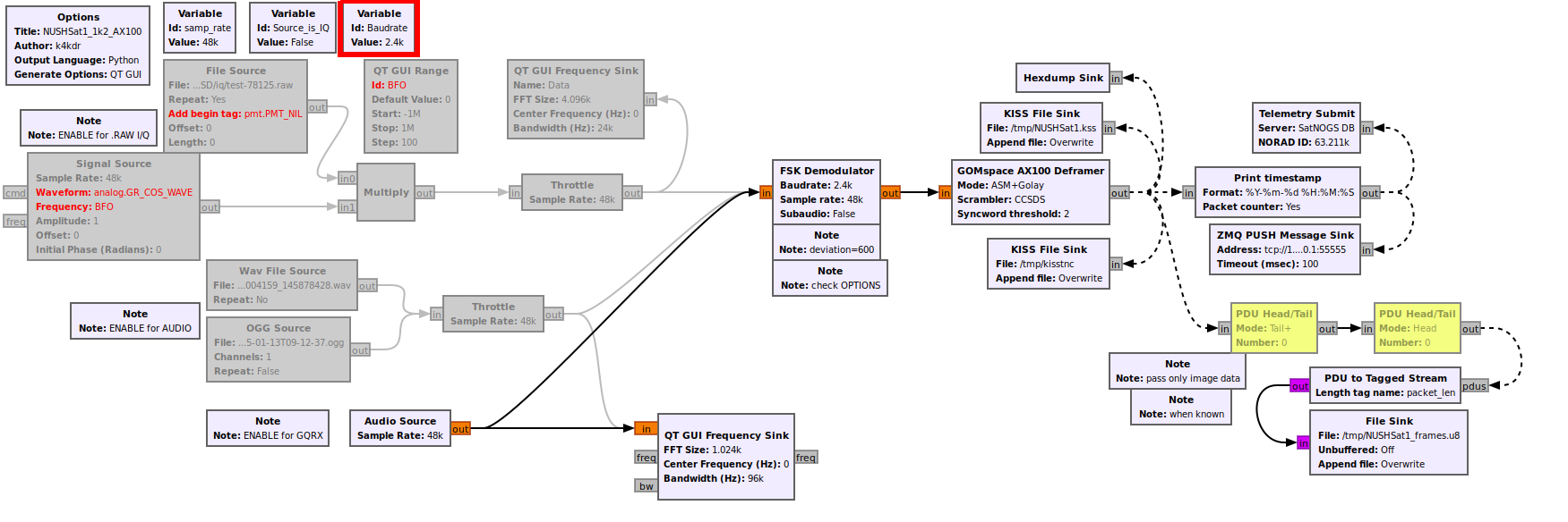 Note that in GQRX, as always, I increased the size of the RF passband to visually be a hair wider than the observed packet and also increased the audio output bandwidth from 2.5k to 5.0k. Here is that flowgraph which outputs to the SatNogs DB as well as various apps such as Direwolf to give me my preferred visual display of decodes here on the screen. I also have it ready to strip the header & checksum bytes from your packets to save image downloads to a binary file. I hope that helps!