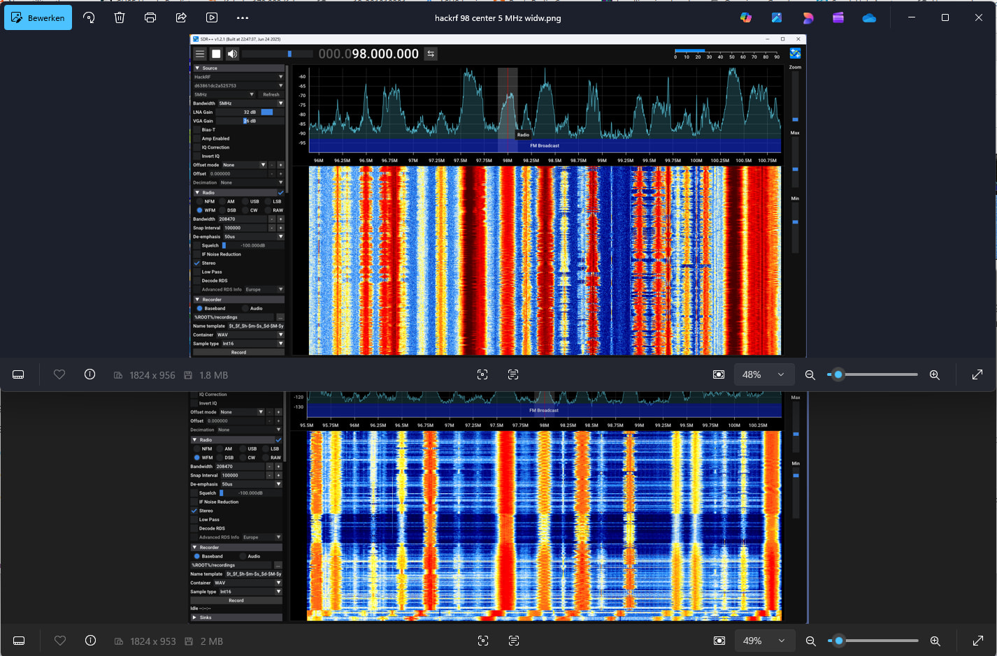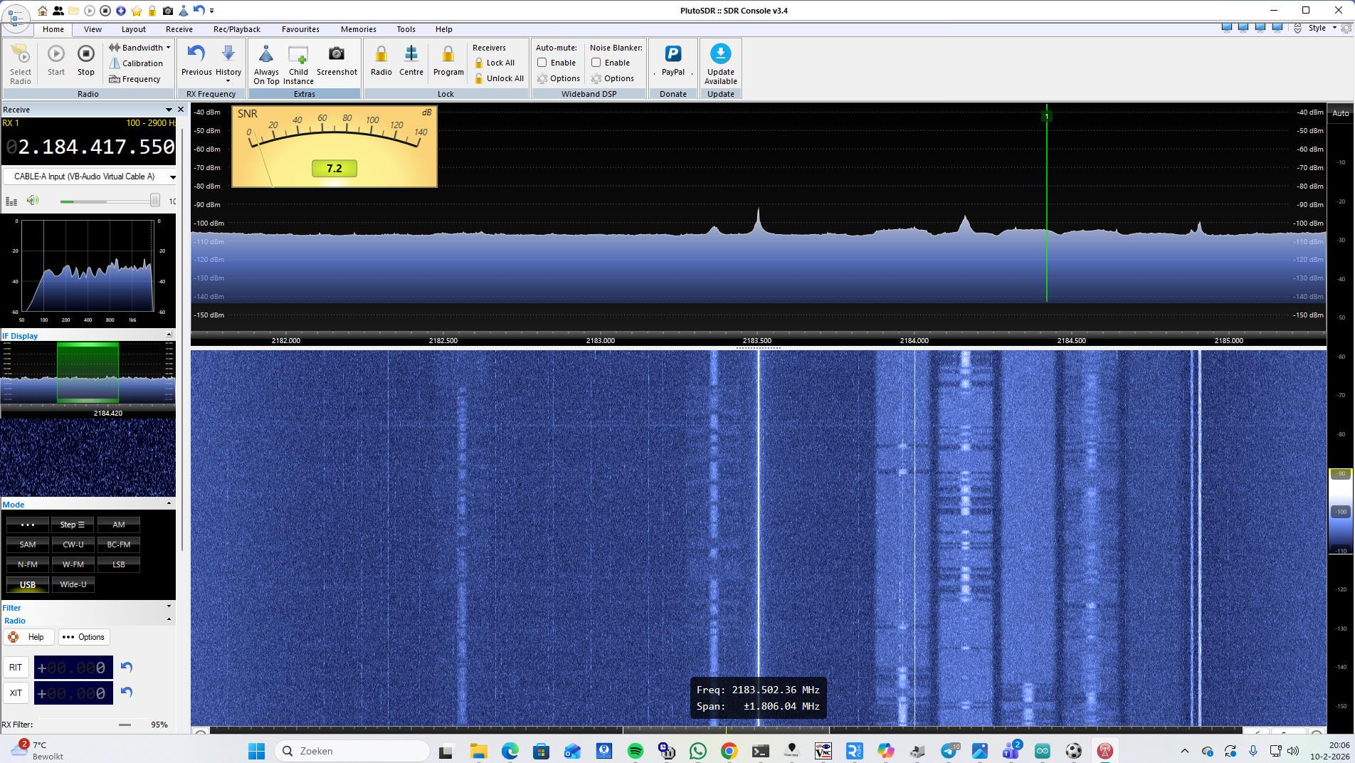 Reception around 2184 MHz is much weaker but still exists, and beacon from PI7RTD on 3400.920 MHz appears on 2 different frequencies about 120 kHz away from each other.