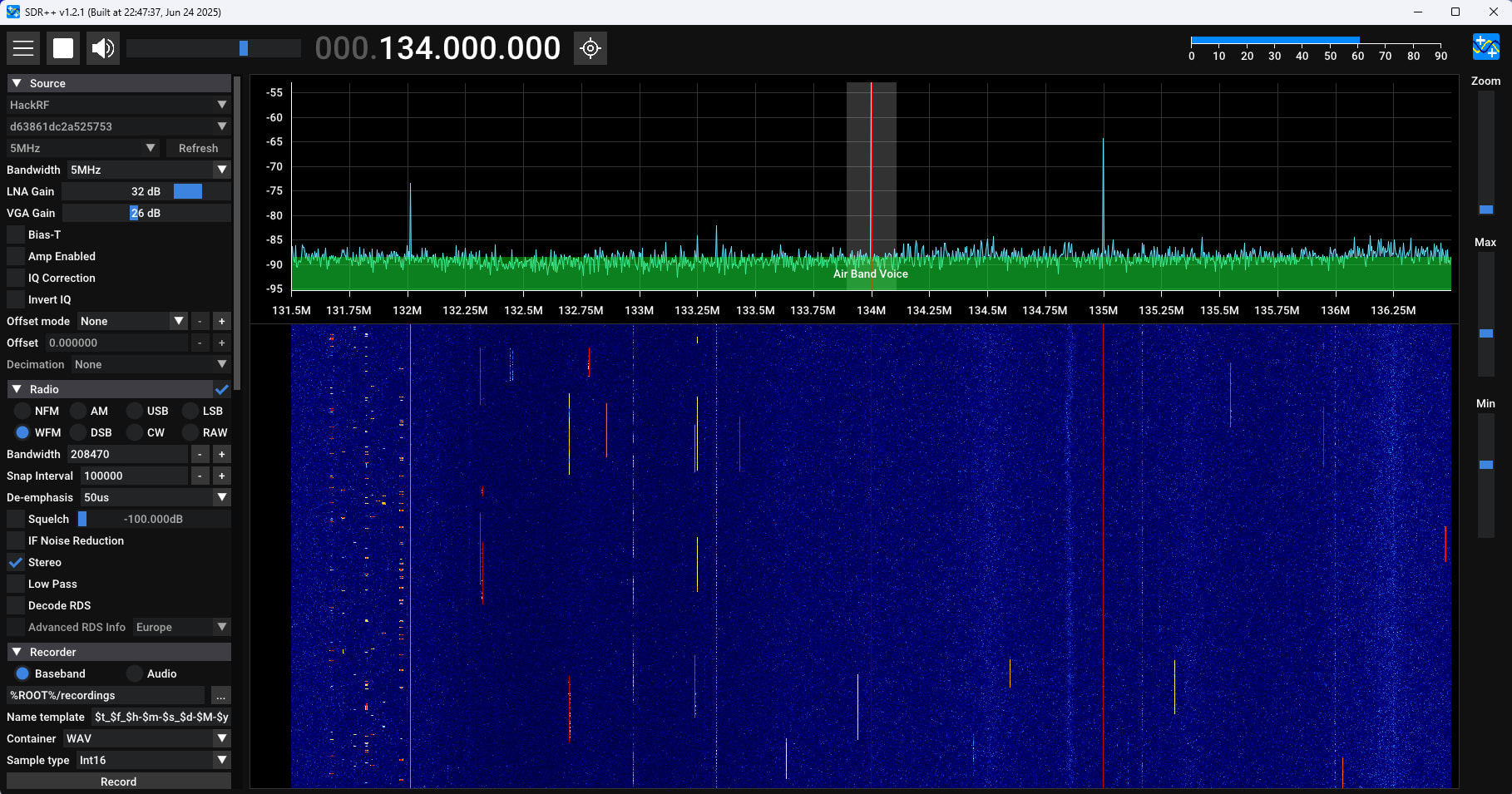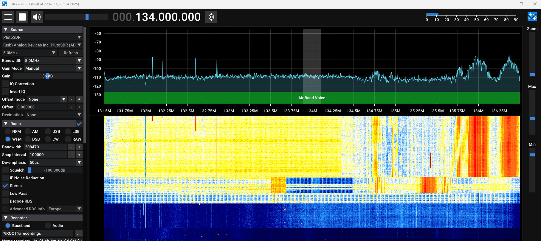So with netscan I noticed the device being around on the network on an DHCP address, added the device as pluto to SDRConsole, with the Ip address and ran it at 5 MHz (about the max SDRConsole can run in this version) tested 2184 MHz on the horizontal logper which appeared nicely in the waterfall.