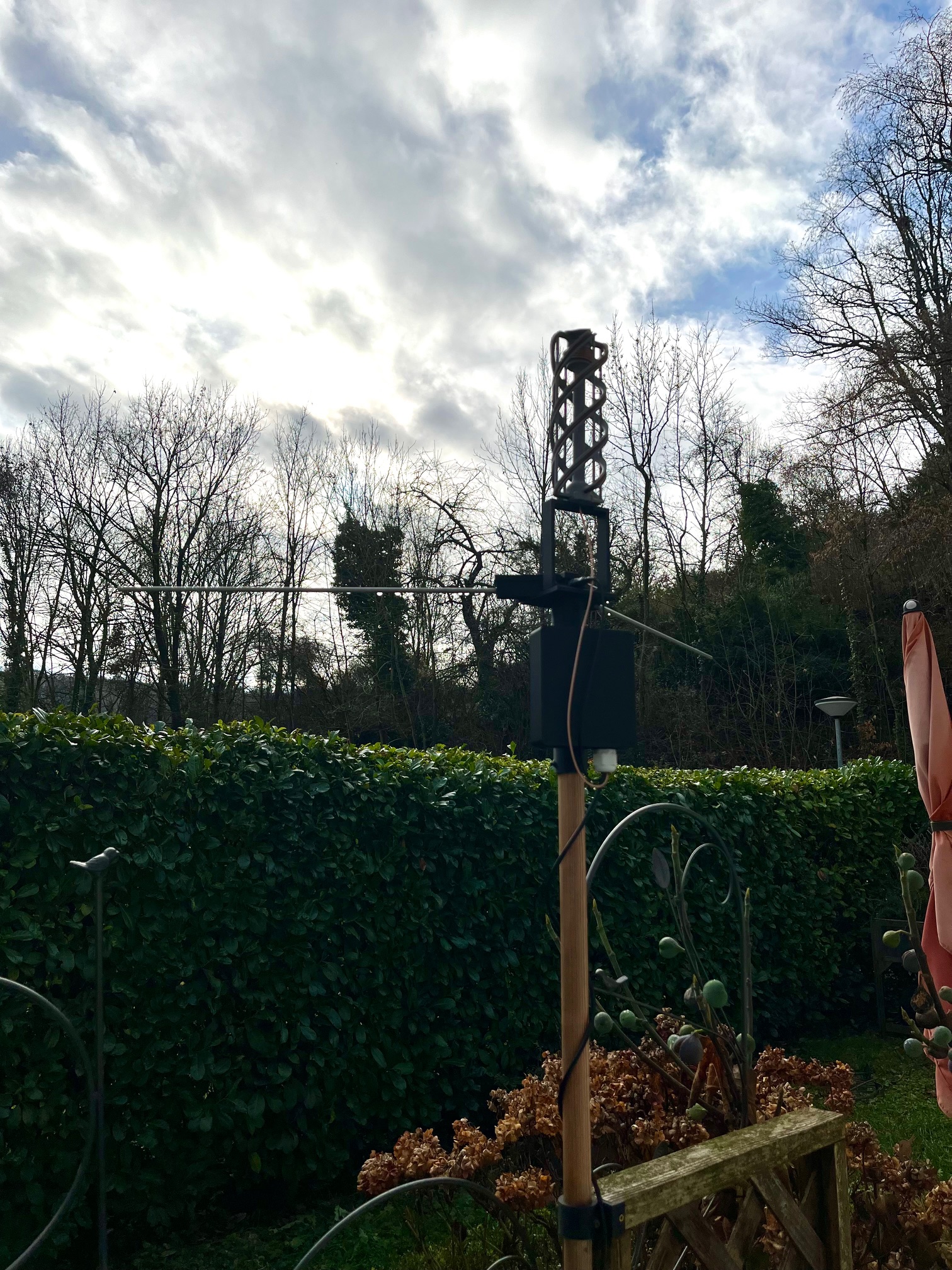 Finally, there’s progress with the antenna. I’ve received all the parts and printed a holder for both antennas that fits onto a suitable wooden post. I’m currently designing and printing a waterproof box for the LNA and the filters. I hope to be able to assemble everything in the next few days and then finally test it.
