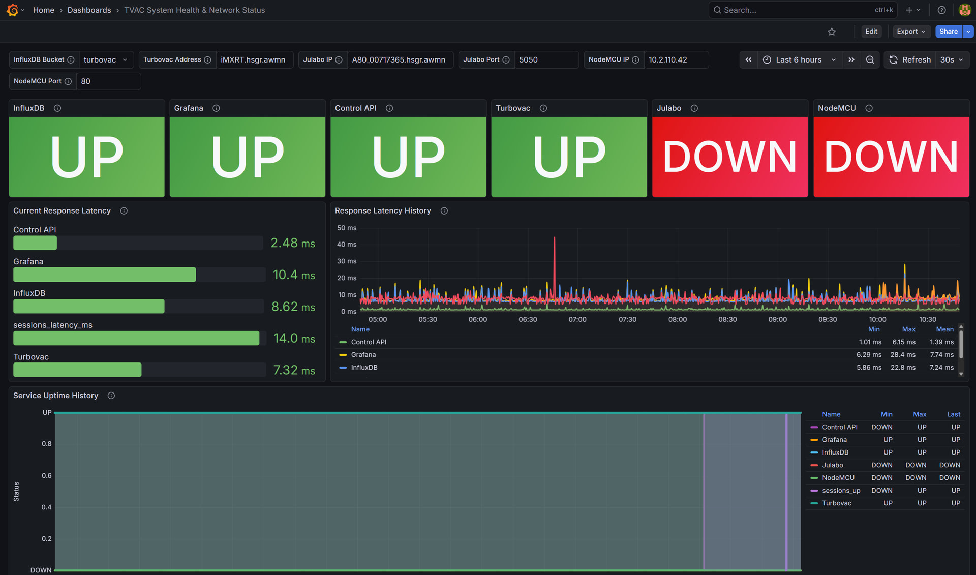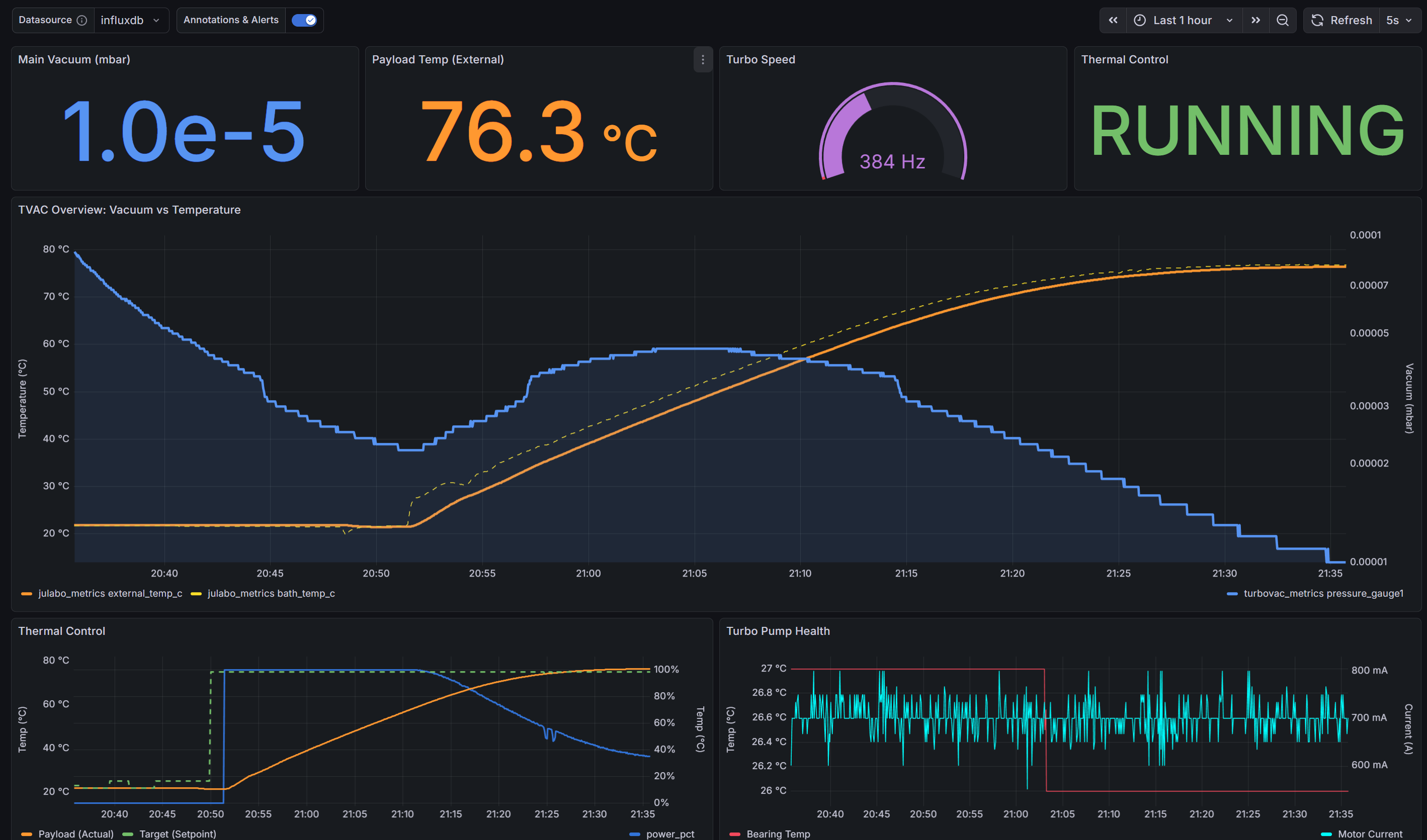 Grafana: For visualization (featuring logarithmic scales for vacuum pressure and traffic light thresholds for bearing temps).