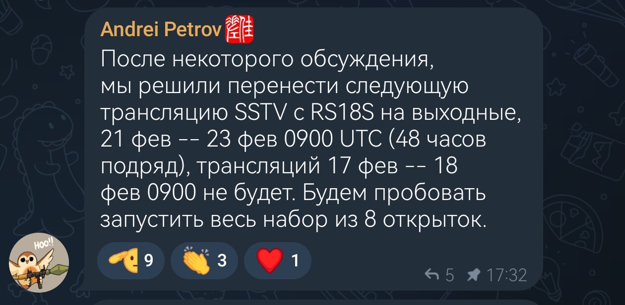 From February 13 (09:00 UTC) until February 16 (09:00 UTC), 2026, SAKHACUBE-CHOLBON (RS18S) CubeSat will be transmitting images via SSTV mode.