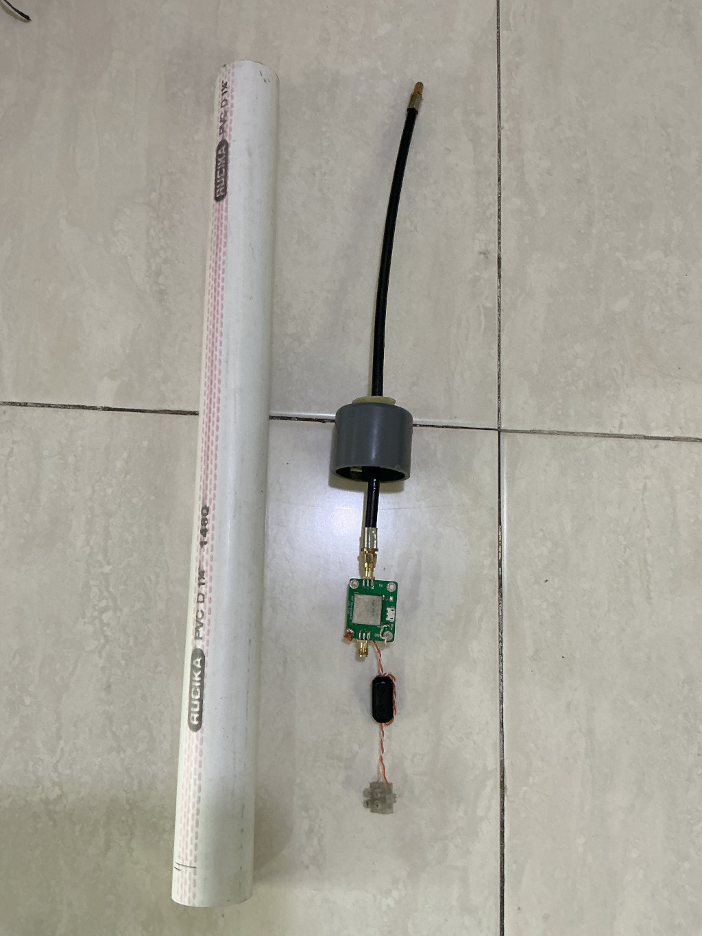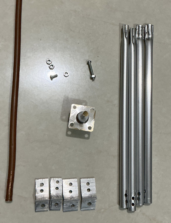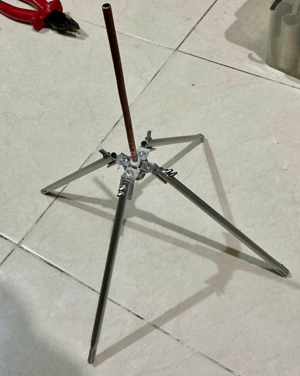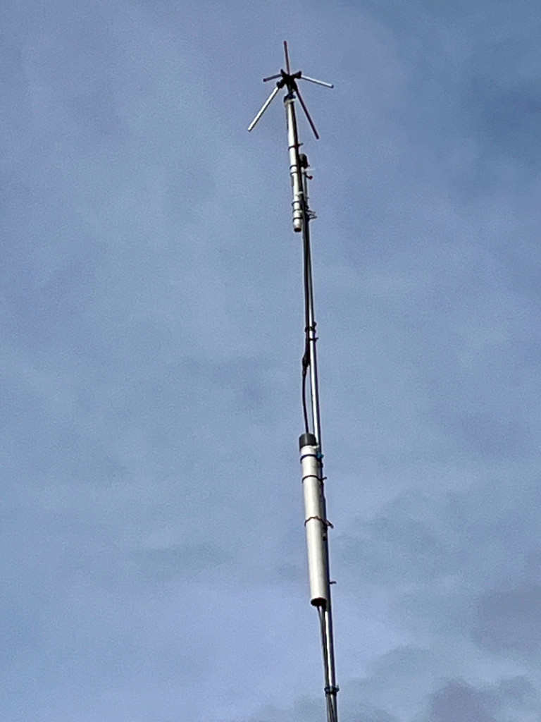 The antenna is made from an aluminum tube for the radials and a copper tube for the driver. I placed the LNA inside a DIY PVC tube case, which is waterproof. The antenna stands on a galvalume pipe, approximately 15 meters above the ground.