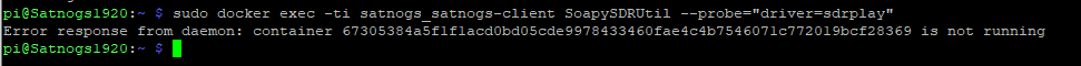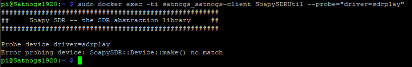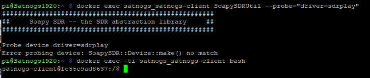 pi@Satnogs1920:~ $ sudo docker exec -ti satnogs_satnogs-client SoapySDRUtil --probe=“driver=sdrplay”