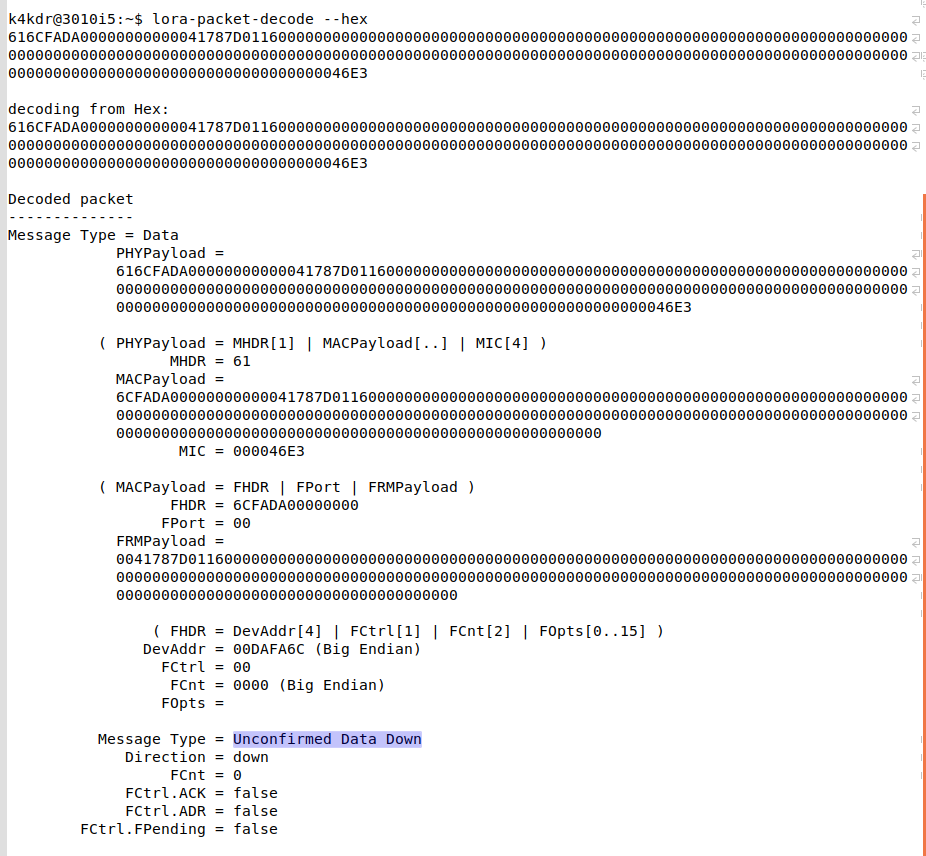 … and sure enough, while everything except the Device Address (DevAddr) and Frame Counter (FCnt) fields are encrypted, the frame does decode as a valid LoRaWAN payload: