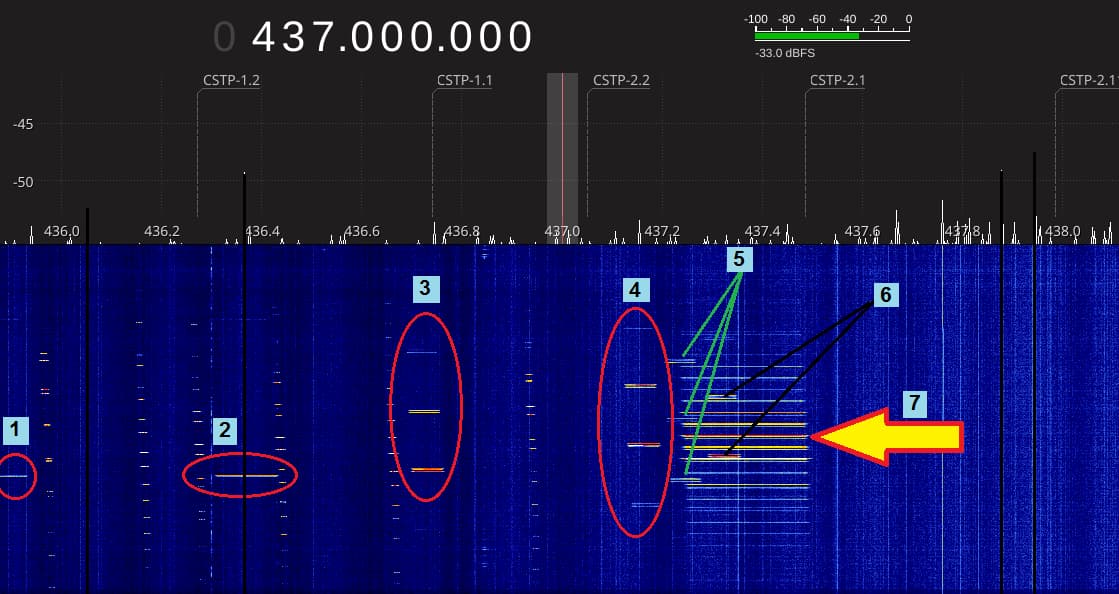 I’m hoping that ‘3’, ‘4’, ‘5’ and ‘6’ turn out to be the CSTP-4.x sats since the bandwidth matches the 62.5k (shown by the cursor that I have right at 437.000 MHz) that the previous CSTP satellites are using.