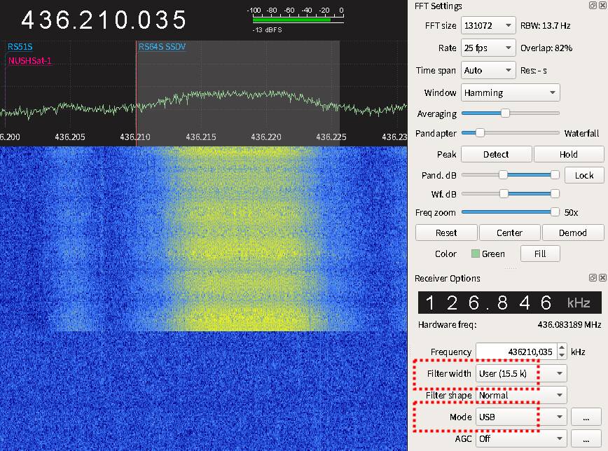 If you see the signal on the waterfall, just set about 15 kHz USB like on this screenshot.
