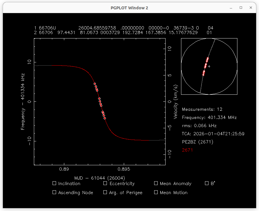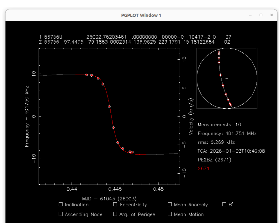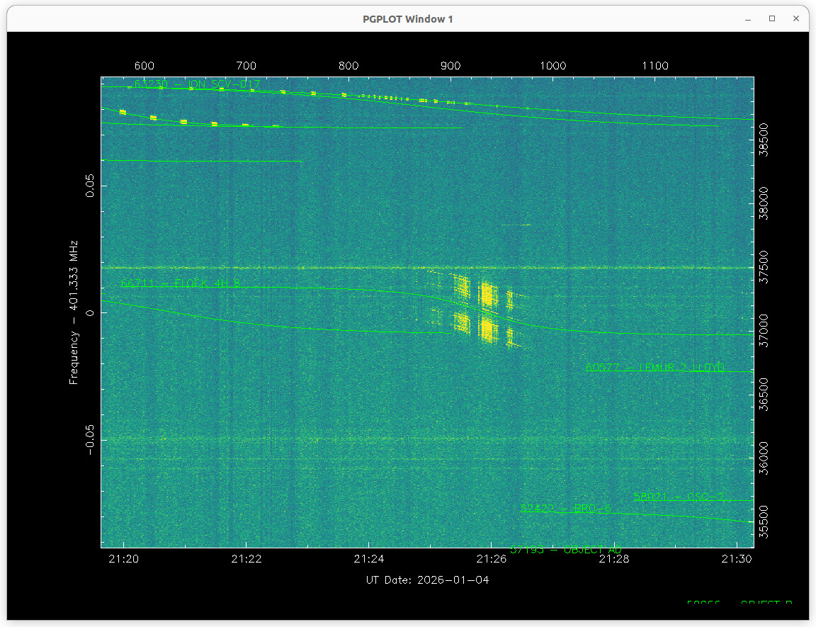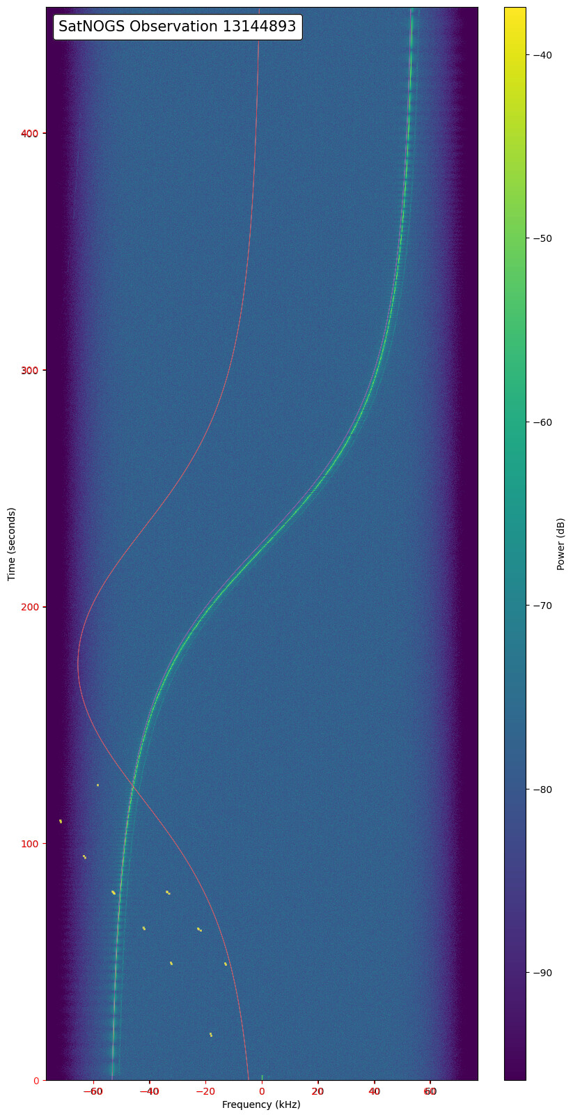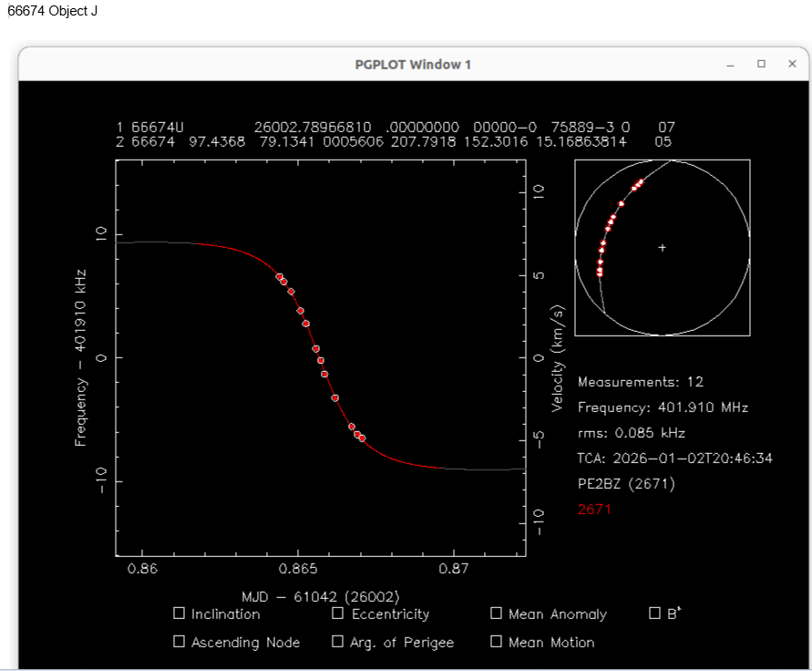 Not sure if we are referring the same blips, I’ve painted a little bolder the blips I’ve seen in this waterfall and my results shows that on the latest TLE objects 66682 and 66670 fit them. The ones you set as candidates looks to be close but not good fits. Another note that 66670 is almost sure that is HUNITY (still with the recent changes it needs verification) and also 66670 is almost 2 days old TLE.