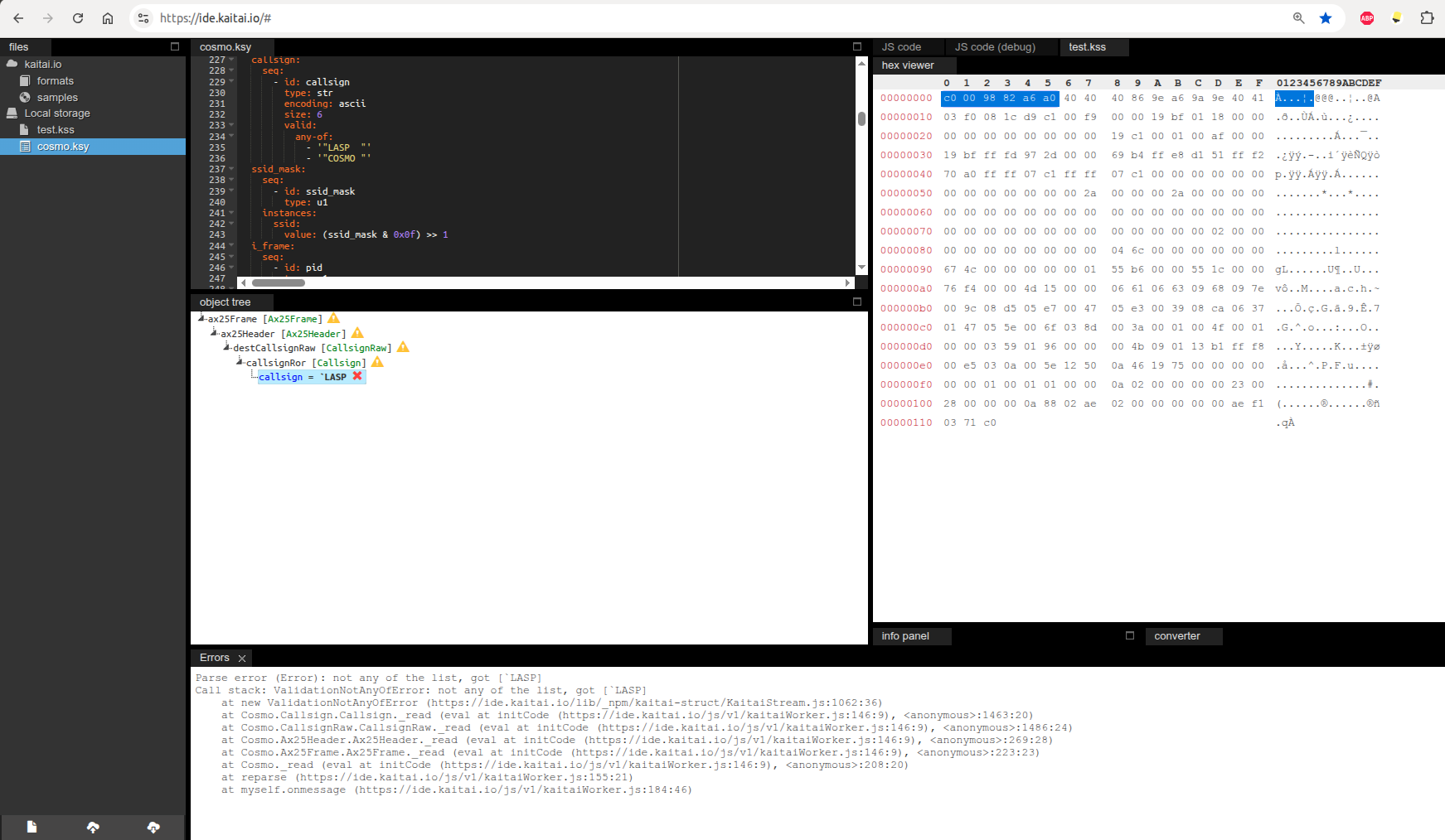 It’s not liking the KSY file, apparently… only reads one of the AX.25 addresses and then stops w/ an error.