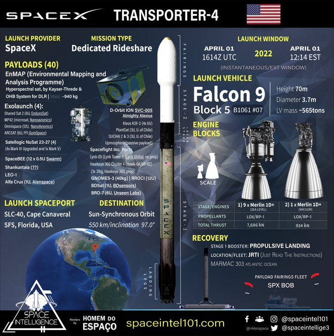 Launch targeting April 1, 2022 on Falcon 9 (booster 1061.7) from Cape Canaveral Space Force Station SLC-40 to SSO. Fairing recovery is expected from the water.